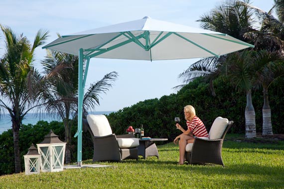 5.- El Parasol Amalfi es visiblemente ligero. El parasol de mástil lateral se sostiene por un lado, dejando un gran espacio libre para sillas y mesas. La sombra de Amalfi sigue el cambio de posición del sol a lo largo del día, estando siempre ahí donde se necesita. Esto es posible gracias a que el mástil de Amalfi es 360° giratorio, sin necesidad de tener que mover la base.